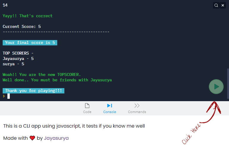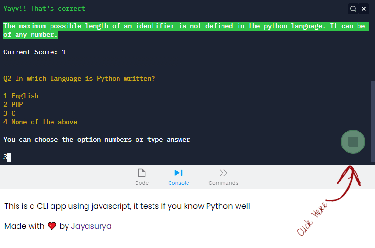 September, 2021This is a CLI app using javascript, it tests if you know python. Repl is embedded on html and hosted using custom subdomain.