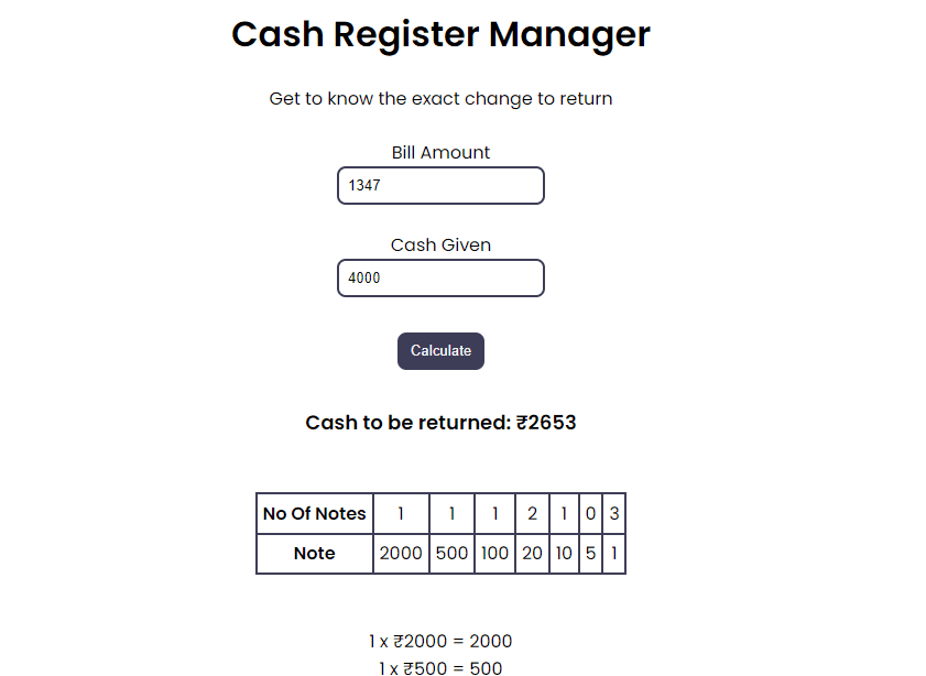 September, 2021A cash register manager which helps the user by telling how to return the change with minimum number of notes.