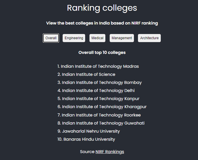 September, 2021This shows the top 10 colleges for engineering, medical, architecture and overall according to NIRF rankings